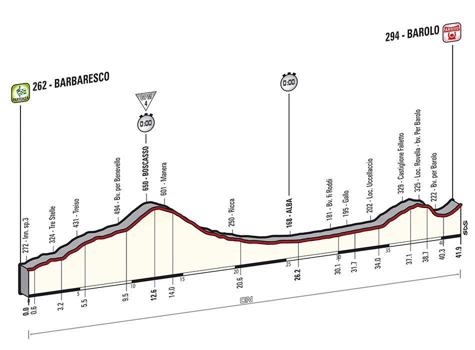 En la segunda semana destaca la llegada a Savona, único día duro sin final en alto, pasando por Nasso di Gatto, que parece duro, a 30 km. de bajada de la meta. Claro, que los favoritos tendrán la mente puesta en la CRI de Barolo que llega al día siguiente, 47 kilómetros con cuestas en los últimos 10.